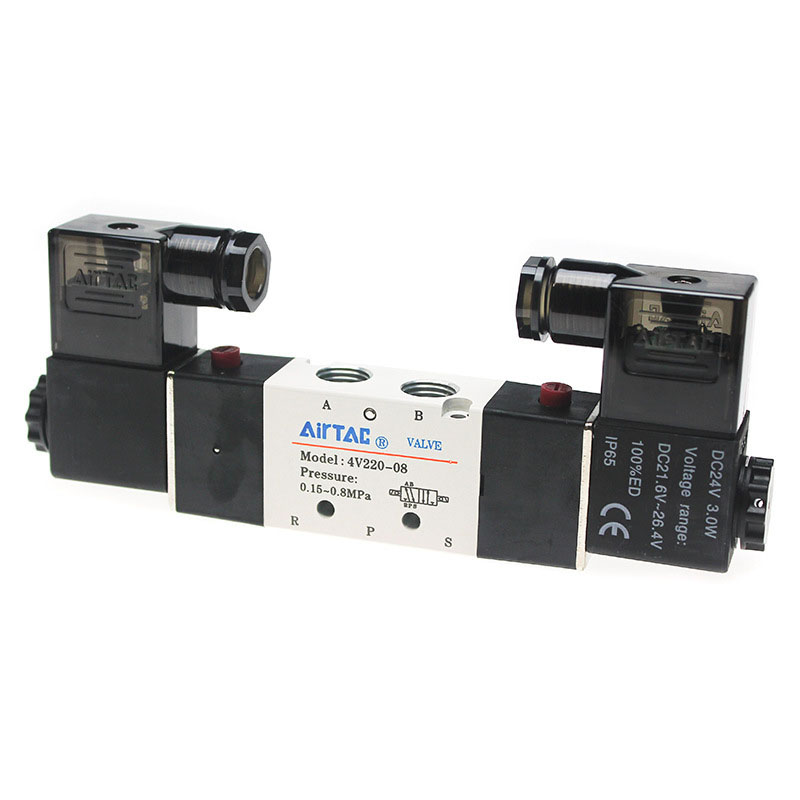Electrovalve pneumatice cu cinci căi și două poziții: Electrovalvele cu cinci căi și două poziții au cinci porturi de intrare/ieșire și două poziții posibile. 4V210, 4V110, 4V310, 4V410, 521 ME, 522 ME. Acestea permit controlul fluxului de aer între diferite porturi în funcție de semnalul electric aplicat. Ele sunt utilizate în aplicații în care este necesară controlul direcției și blocarea fluxului de aer către mai multe dispozitive sau în cazul operării simultane a mai multor cilindri pneumatici.